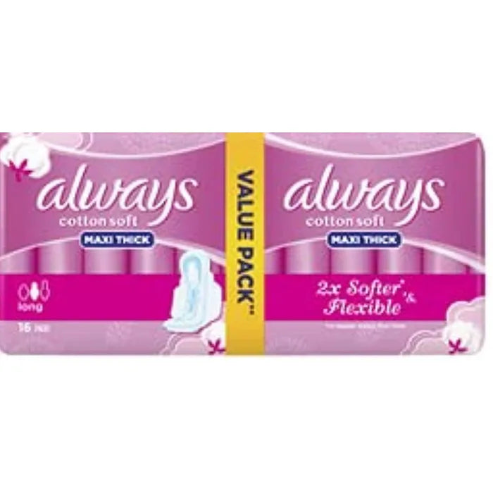 أولويز كوتون سوفت ماكسي ثيك لونج - 16 قطعة | نعومة قطنية وحماية قوية \nاختاري الراحة والنعومة مع فوط أولويز كوتون سوفت ماكسي ثيك لونج، المصنوعة من أجود أنواع القطن لتوفير حماية فائقة مع ملمس ناعم. تأتي العبوة مع 16 قطعة لضمان تغطية مثالية كل يوم \n✅ مصنوعة من قطن عالي الجودة \n✅ امتصاص فعال لمنع التسرب \n✅ راحة قطنية ناعمة طوال اليوم