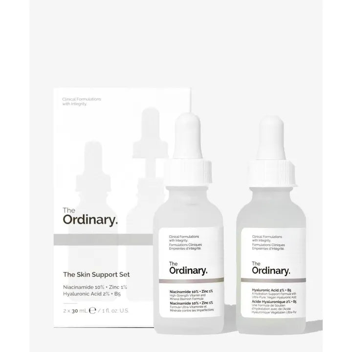 ذا أورديناري مجموعة دعم البشرة 2x30 مل (نياسيناميد + حمض الهيالورونيك): \nتتكون مجموعة دعم البشرة من ذا أورديناري من سيرومين هما سيروم النياسيناميد 10% وسيروم حمض الهيالورونيك 2% .